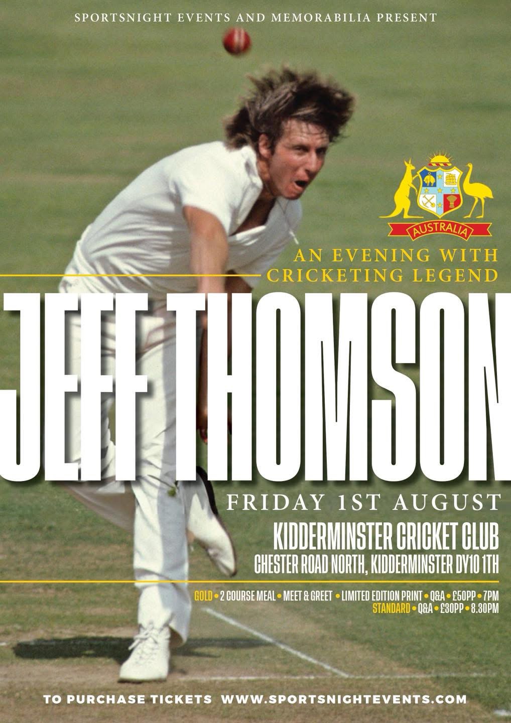 Sportsnight Events host an Evening with Australia fast bowling legend Jeff Thomson at Kidderminster Cricket Club. The night will be MC’d by Richard Sydenham