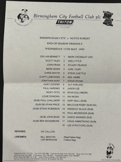 Official Birmingham City v Nott’m Forest Team Sheet, 1995