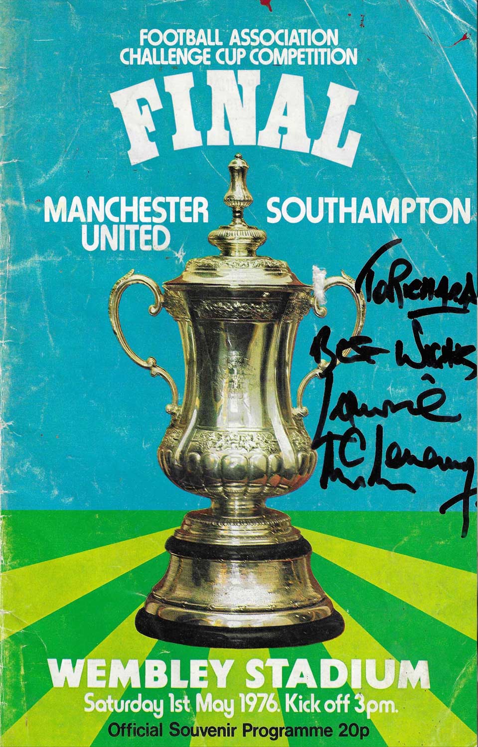 Victorious FA Cup-winning Southampton manager Lawrie McMenemy has signed the front cover of the official match day programme for the clash against Tommy Docherty’s Manchester United team. The message is dedicated.