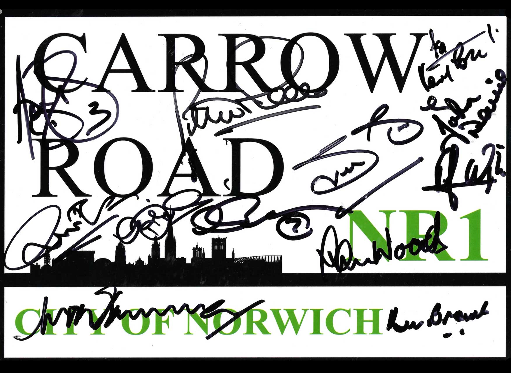 Canaries legends have signed this metal Carrow Road road sign. Those who have signed are: cup-winning manager Ken Brown, Steve Bruce, Chris Woods, Adam Drury, Peter Mendham, Mark Barham, Dennis Van Wyk, Paul Haylock, Asa Hartford, Mick Channon, Louie Donowa and John Devine. Most signatures with secured at the 1985 40th anniversary dinner event that Big Star Creations organised. Steve Bruce signed at Blackpool FC training ground and Adam Drury signed at Carrow Road.